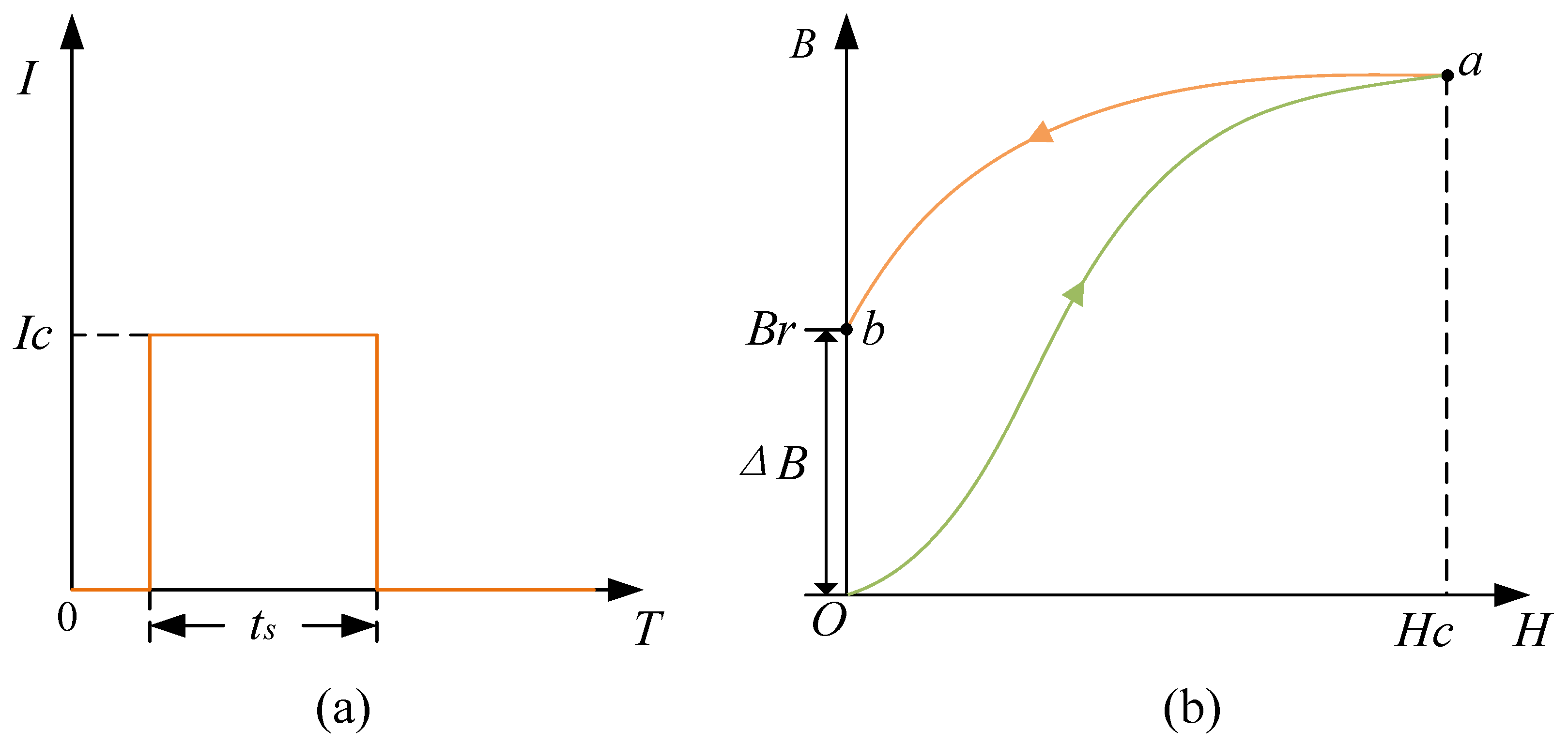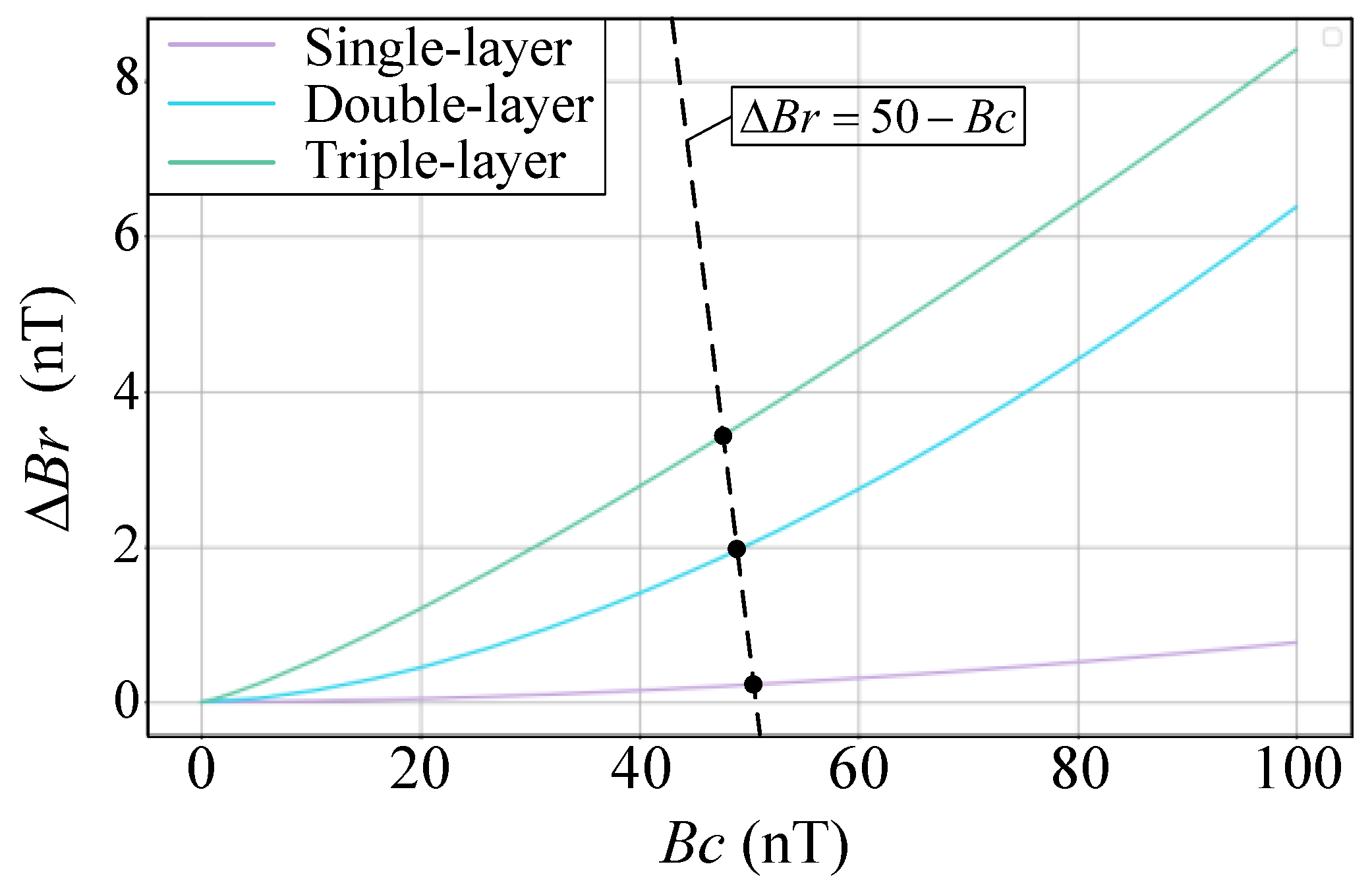 - The center point is selected as the reference point to measure the magnetic field. For a given compensation field at the center, the corresponding current is determined, and then the change in the central magnetic field relative to the initial residual magnetic field, , is calculated after the current is removed.