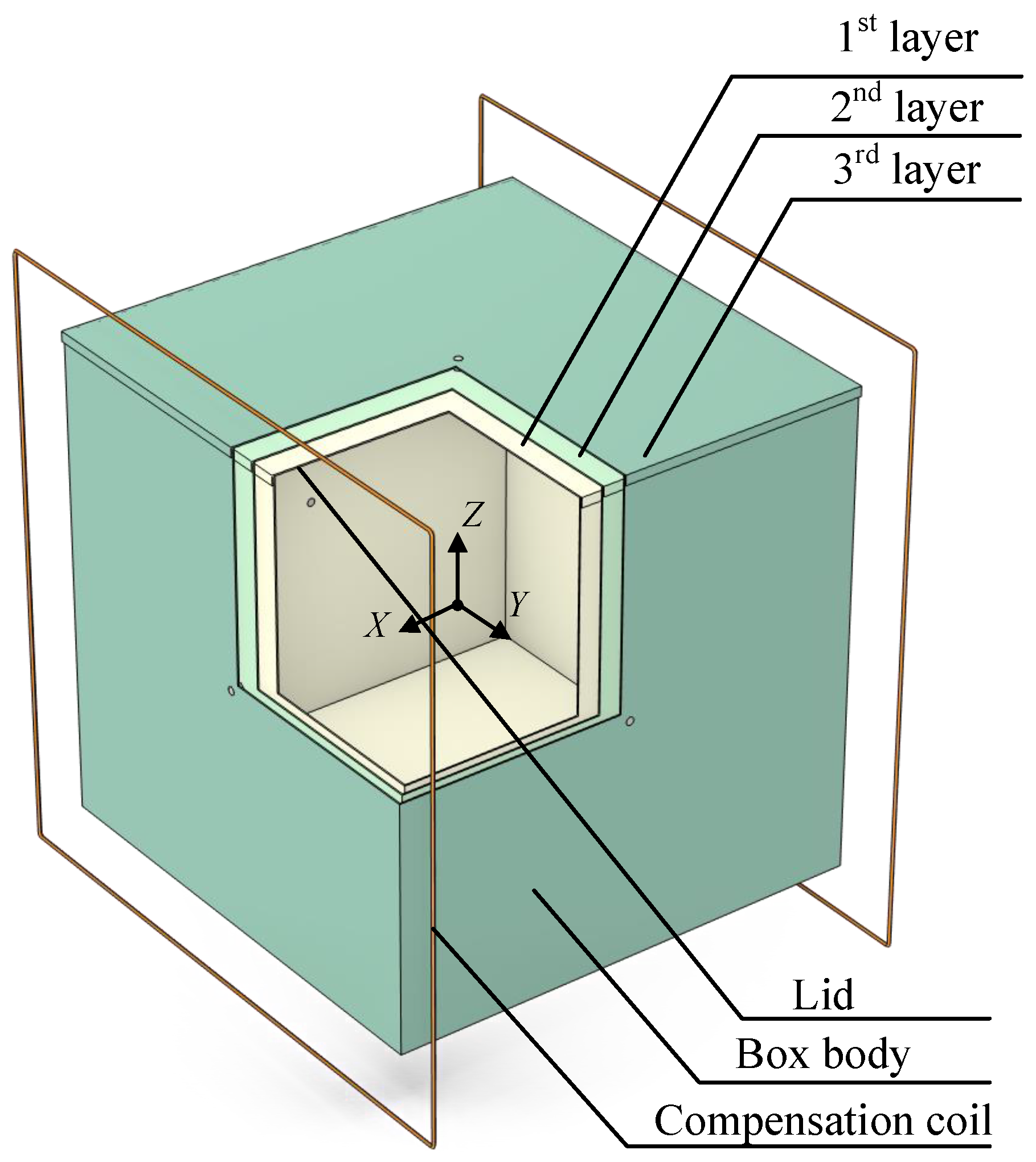 - Sun, Z.; Schnabel, A.; Burghoff, M.; Li, L. Calculation of an optimized design of magnetic shields with integrated demagnetization coils. AIP Adv. 2016, 6, 075114. [Google Scholar] [CrossRef]