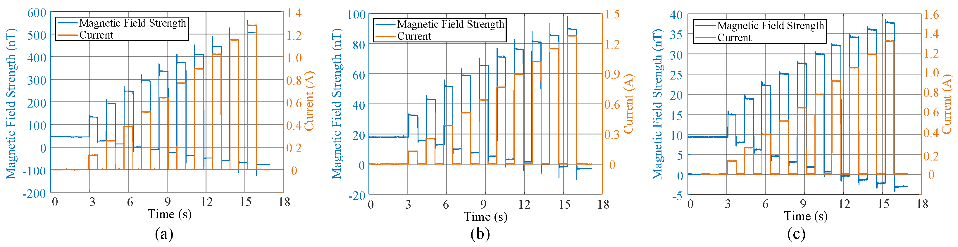 - Pan, D.; Li, J.; Jin, C.; Liu, T.; Lin, S.; Li, L. A new calibration method for triaxial fluxgate magnetometer based on magnetic shielding room. IEEE Trans. Ind. Electron. 2020, 67, 4183–4192. [Google Scholar] [CrossRef]