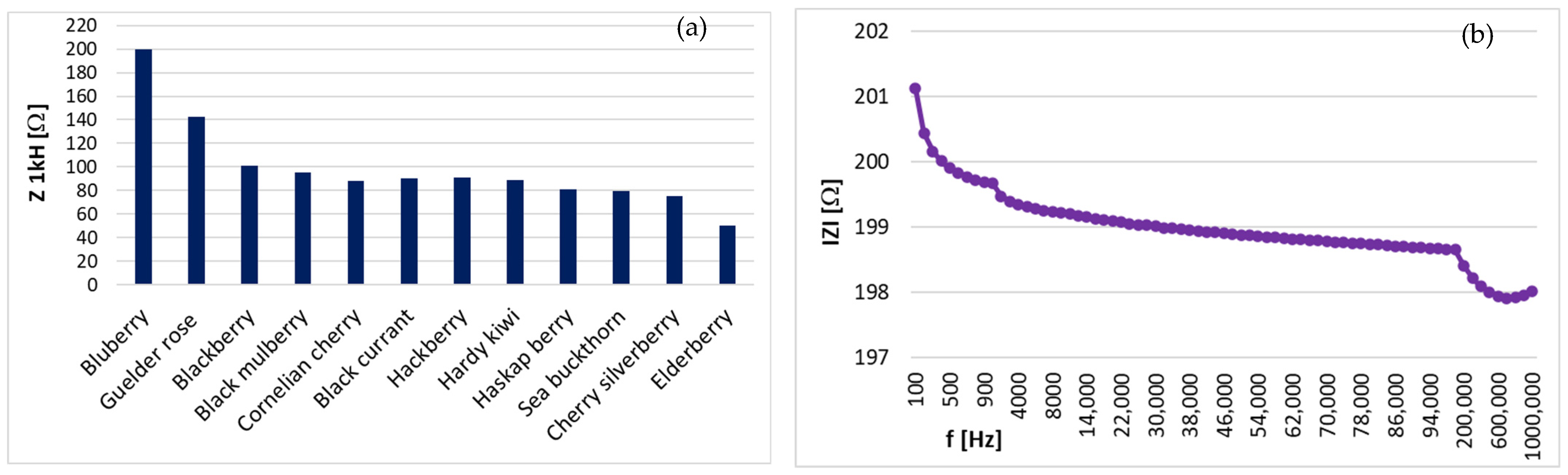 - Rehman, M.; Abu Izneid, B.A.; Abdullah, M.Z.; Arshad, M.R. Assessment of quality of fruits using impedance spectroscopy. Int. J. Food Sci. Technol. 2011, 46, 1303–1309. [Google Scholar] [CrossRef]