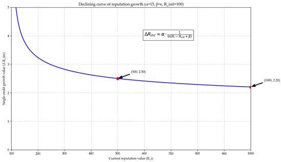 Formula explanation: This is a decreasing function. As shown in Figure 1, when is low, the value of is small, and the denominator is small, so is large, indicating a rapid increase in reputation. When is high, the logarithmic function grows slowly, and the denominator is large, so is small, indicating extremely slow reputation growth. This ensures that new nodes or low-reputation nodes can quickly catch up through good behavior, while veteran nodes cannot infinitely widen the gap by relying on their early advantages.