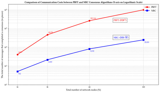 First, we used two independent sets of experimental data ( and ) to fit the model parameters separately; the deviation in prediction results was <5%. We then analyzed the impact on large-scale predictions when key parameters (such as the network latency coefficient and the number of nodes per shard) fluctuated within a ±20% range. The results show that the conclusion of NRC’s performance advantage (>10× that of PBFT) holds under all reasonable parameter settings. Finally, when is very large, the asymptotic complexity of the algorithms (O(N2) vs. ) becomes the dominant factor determining performance differences, while the influence of constant factors diminishes relatively. Therefore, extrapolation based on theoretical complexity is more convincing for large-scale scenarios.