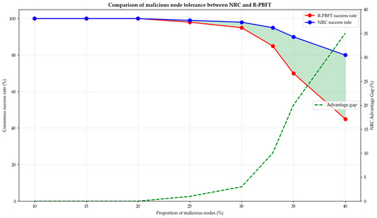 This is asymptotically equivalent to the classical PBFT bound . However, due to shard isolation and the reputation mechanism, the actual tolerable proportion of malicious nodes is higher in a dynamic network. The experimental data in Figure 6 validate this point: NRC maintains a 95% consensus success rate even when the malicious node ratio reaches 33%.