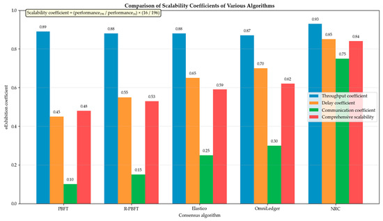 As shown in Figure 12, in the horizontal comparison of system scalability, NRC performs well in large-scale networks. The comprehensive scalability coefficient of NRC reaches 0.84, significantly higher than other algorithms, with a communication coefficient of 0.75 being particularly outstanding. This indicates that the architecture design of NRC can effectively address the challenges brought by the increase in the number of nodes. The NRC uses a dynamic grouping mechanism to break down the large-scale performance requirements brought about by network scale growth into small-scale performance requirements that can be processed in parallel. This scalable design enables NRC to support large-scale networks with thousands or even tens of thousands of nodes, providing technical feasibility for building enterprise-level blockchain infrastructure.