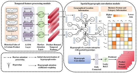 The proposed Spatiotemporal Hypergraph Attention Network (STHA) comprisestwo main components: a temporal feature processing module and a spatial hypergraph convolution module (Figure 1). The model takes as input the historical sales data from all market entities over the past t days. First, in the temporal dimension, the temporal feature processing module employs a Long Short-Term Memory (LSTM) network to extract temporal dependency information from the sales data of each market entity. It incorporates a Hawkes process-based temporal attention mechanism to dynamically evaluate the importance of different historical time points for future predictions. This module outputs a temporal feature representation for each market entity. Subsequently, in the spatial dimension, a hypergraph is constructed based on spatial relationships—such as geographical proximity and groupings based on business format and product category—to represent complex higher-order correlations among multiple market entities. The spatial hypergraph convolution module takes the output from the temporal feature processing module as the initial node features of the hypergraph. It enables higher-order message passing and feature aggregation through hypergraph convolution layers and incorporates a hypergraph attention mechanism to adaptively learn the contribution scores of different spatial relationships to the prediction outcome. This enables the effective adjustment of external market influences on an entity’s own demand during joint multi-time-series forecasting tasks. The module outputs node representations enhanced by spatial relationships, integrating both the entity’s own historical patterns and influences from related market entities. Finally, the output of the spatial hypergraph convolution module is passed through a fully connected output layer followed by a nonlinear activation function to generate the final product demand predictions for all market entities. Through the coordinated design of its spatiotemporal modules, the framework enables unified modeling of temporal dynamics and spatial dependencies, thereby significantly improving the model’s ability to capture multi-dimensional interaction patterns in complex market environments.