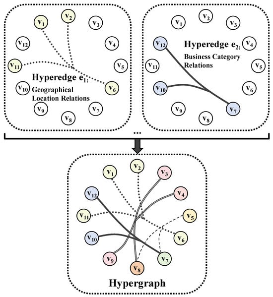 In the hypergraph, each vertex v ∈ V represents a market entity within the region, and each hyperedge e ∈ ε connects a set of related market entities {v1, v2,…, vn} ∈ V. Each hyperedge e is assigned a positive weight d(e), and all weights are stored in a diagonal matrix D ∈ R|ε|×|ε|. Initially, D is set to the identity matrix, indicating that all hyperedges are assigned equal weights. A schematic diagram of the market entity hypergraph is shown in Figure 2.