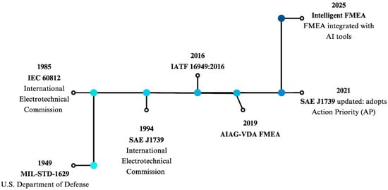 The first mentions of the FMEA method date back to the 1950s and 1960s, when the aerospace and defense industries began focusing on identifying potential failure modes in complex systems. During this period, the American military standard MIL-STD-1629 was developed. In 1985, the International Electrotechnical Commission (IEC) published the IEC 60812 standard, followed by SAE J1739 in 1994, which formalized the guidelines for the FMEA methodology. Today, standards such as IATF 16949:2016 mandate the use of FMEA to ensure product safety and quality, particularly in the automotive industry [2,3]. The use of Large Language Models (LLMs), such as GPT, in FMEA is a relatively new trend that has emerged in recent years. The application of modern AI tools and LLMs in this area began to develop only in the 21st century, especially at the end of the 2010s, when artificial intelligence started to gain significance. Figure 1 shows key dates and standards related to the development of the FMEA method, selected subjectively. Intelligent FMEA highlights the use of AI tools to improve the traditional FMEA process, making it more efficient and predictive.
