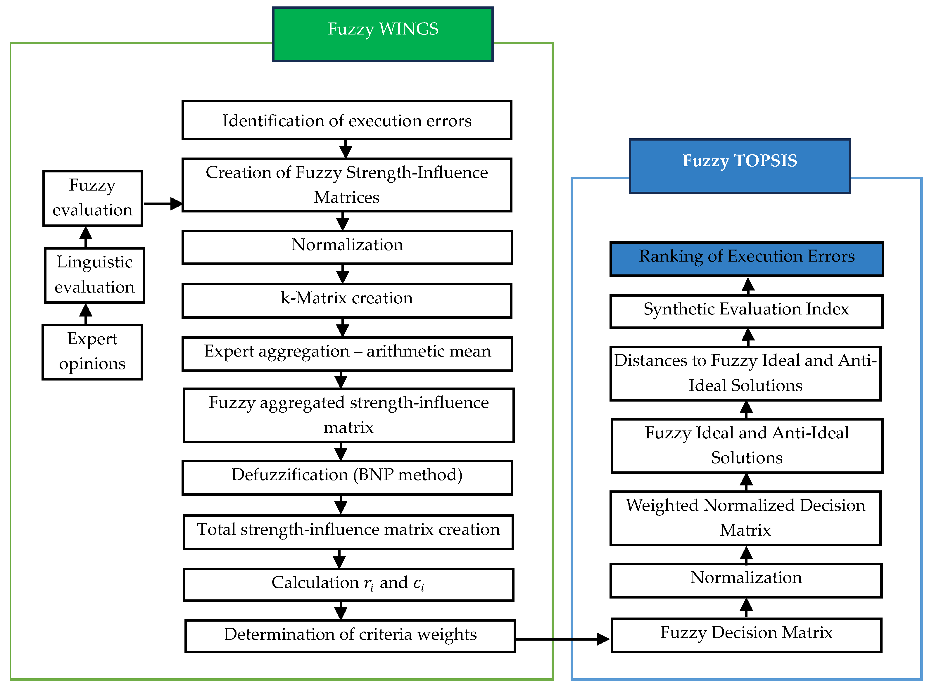 To meet the requirements associated with the assessment of execution errors, a hybrid approach was adopted—combining the fuzzy WINGS method with the fuzzy TOPSIS method. The proposed hybrid model enables the evaluation and comparison of execution errors in reinforced concrete structures, while the incorporation of fuzzy logic allows for handling imprecise variables and uncertainty inherent in expert assessments. The core principle of hybrid methods is the ability to exploit the strengths of both combined approaches while reducing the impact of their limitations [