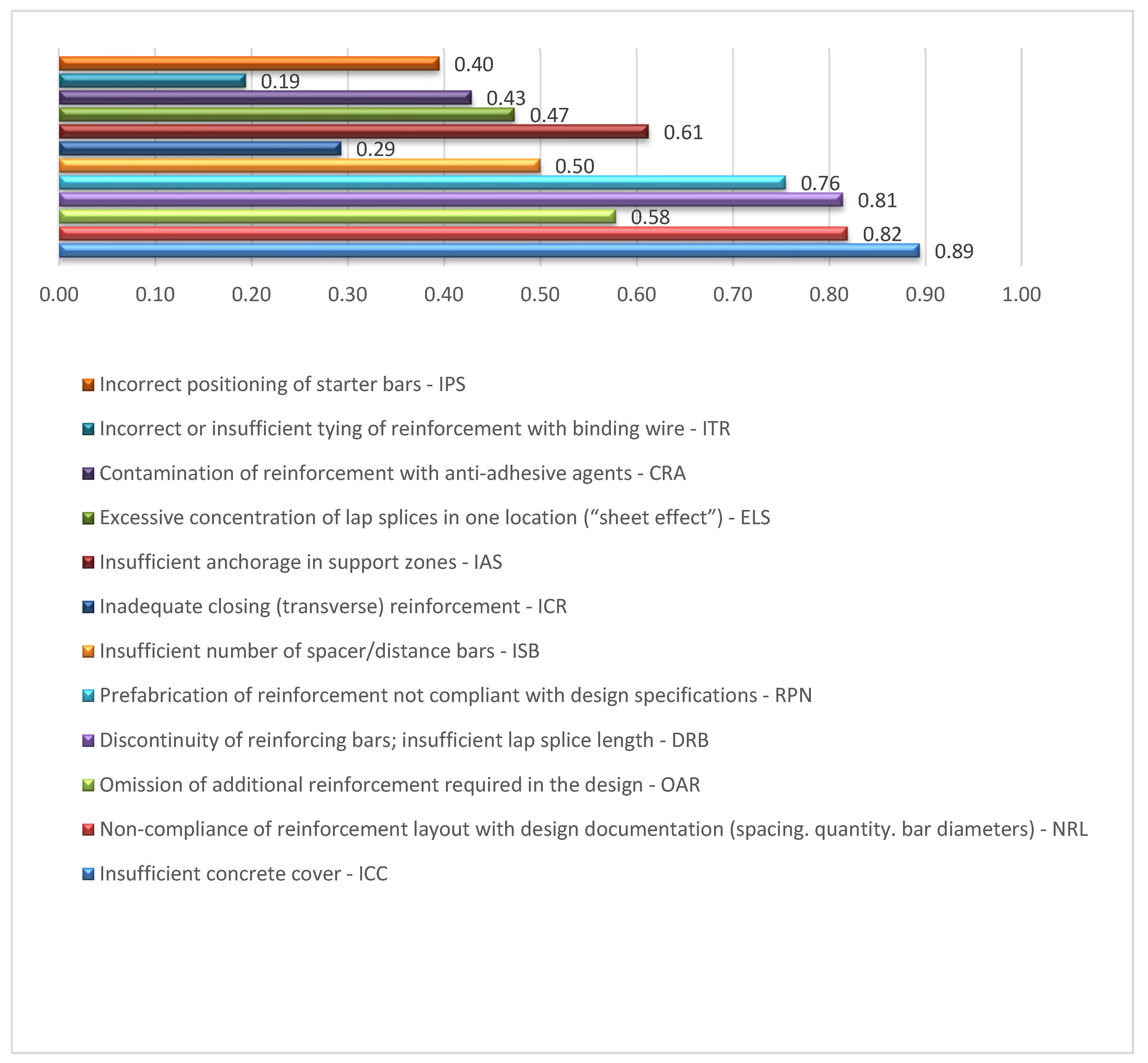 Improper reinforcement and formwork execution: 0.174, 0.173, 0.183, 0.183, 0.183, and 0.102 (
