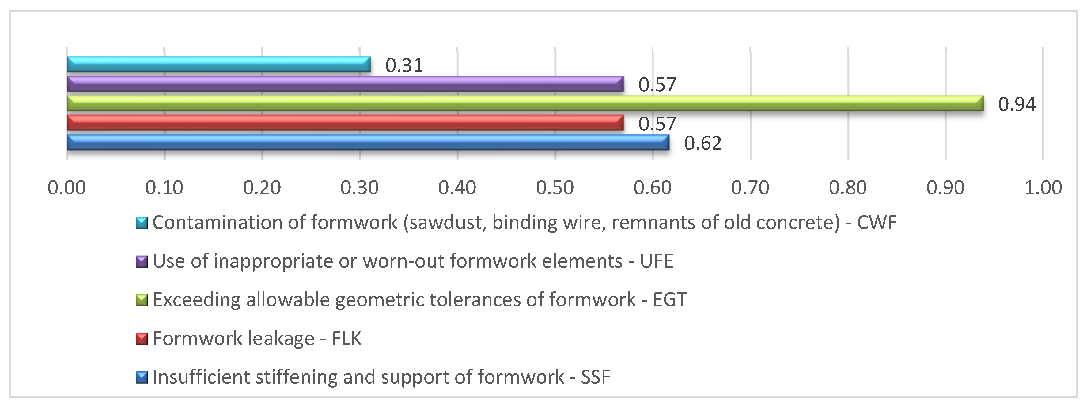 The highest score was obtained for exceeding permissible geometric deviations of formwork (EGT)—0.94. This is a highly significant error because it directly affects the geometry of the constructed element. Excessive geometric deviations may lead to serious structural defects and, in extreme cases, require partial demolition of the element. High significance also characterized insufficient stiffening and support of formwork (SSF)—0.62—as well as formwork leakage (FLK) and use of inappropriate or worn formwork components (UFE)—both scoring 0.57.