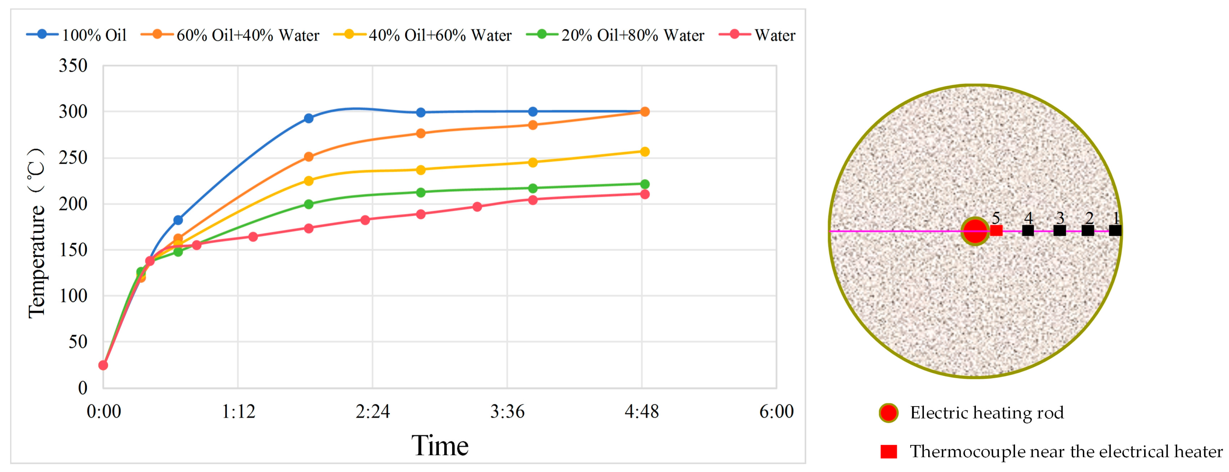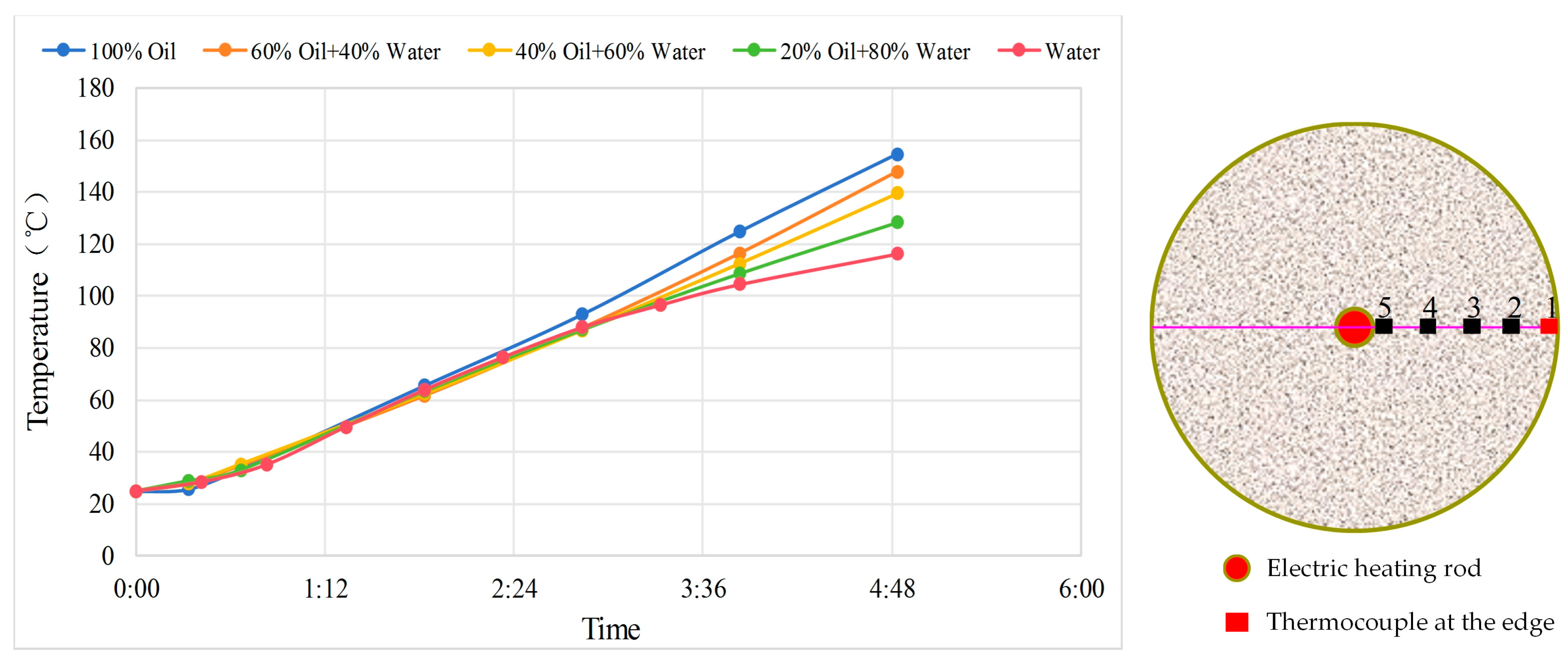After sand packing, the model was evacuated and then saturated with five different oil-water ratio combinations. Following electrical heating, temperature measurements from the thermocouples were compared to evaluate the heat transfer performance across different schemes. The specific wellbore fluids for each scheme are as follows: 100% water, 20% oil–80% water, 40% oil–60% water, 60% oil–40% water, 100% oil.