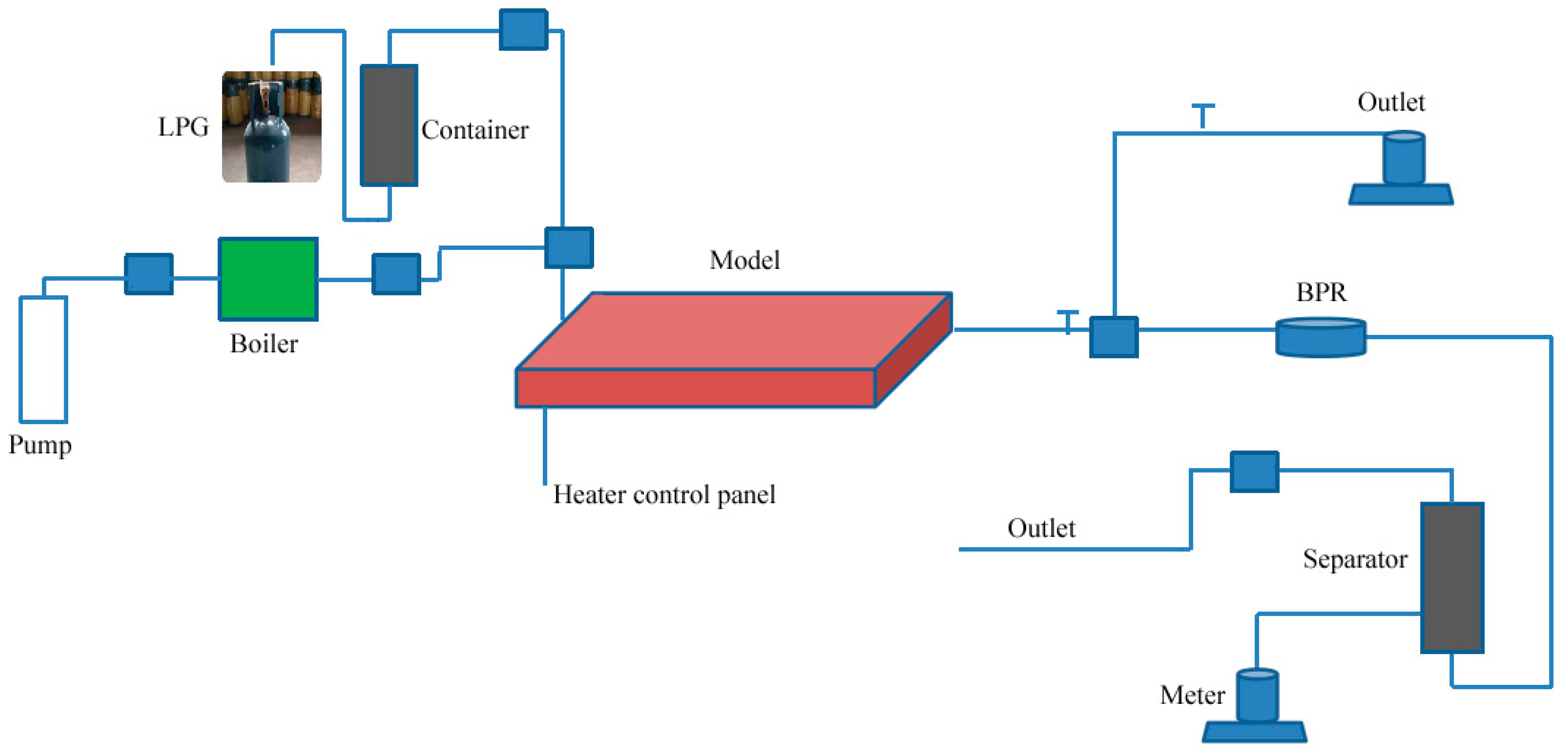 Figure 4): (1) Injection module, including solvent gas cylinder (LPG used here), steam generator, high-pressure displacement pump, intermediate containers, etc.; (2) High-temperature high-pressure 3D model body (see