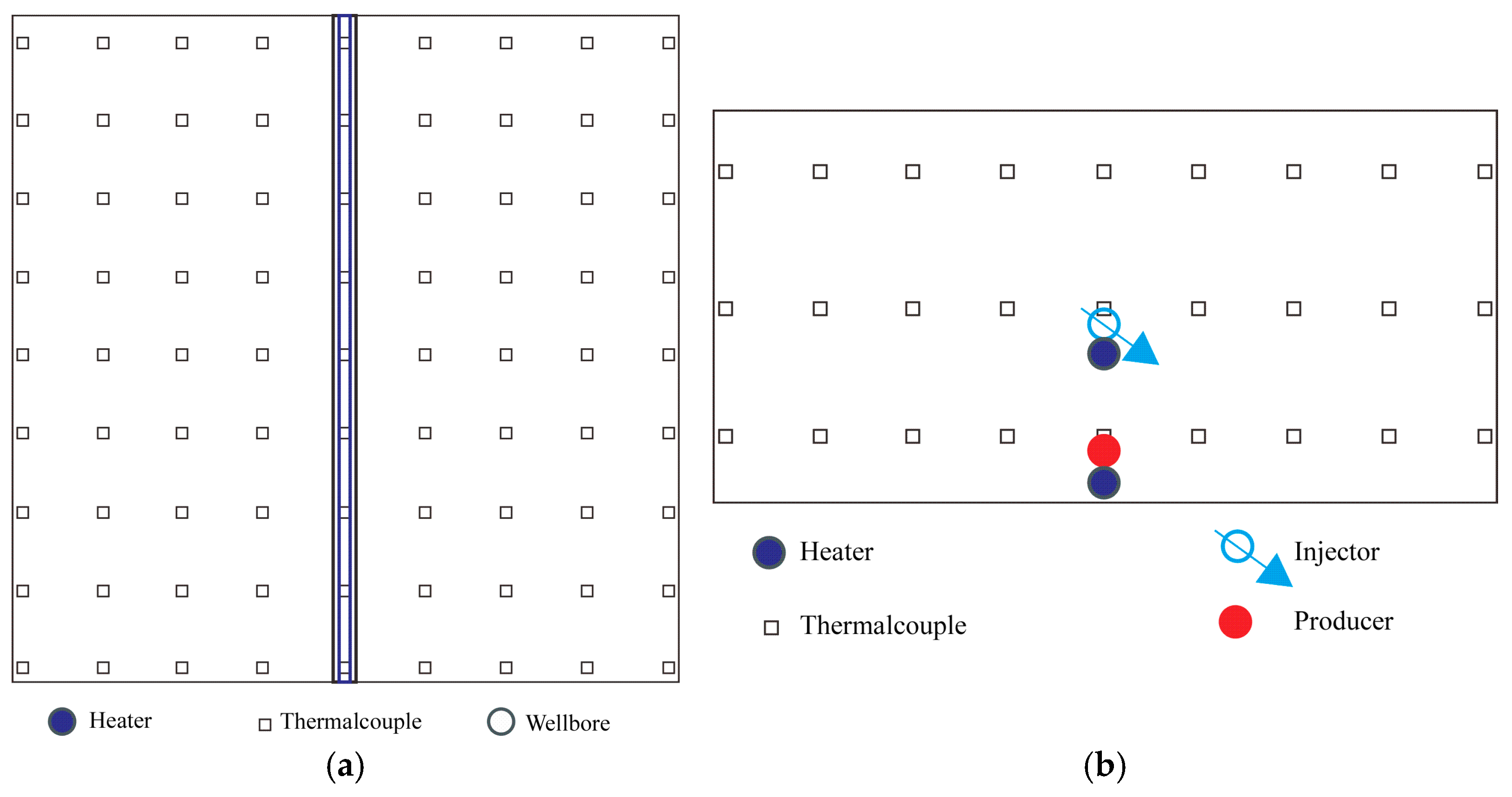 A schematic diagram of the internal layout of heaters, temperature measurement points, and wells in the model body. (a) Top view of the model ontology; (b) Side view of the model ontology.