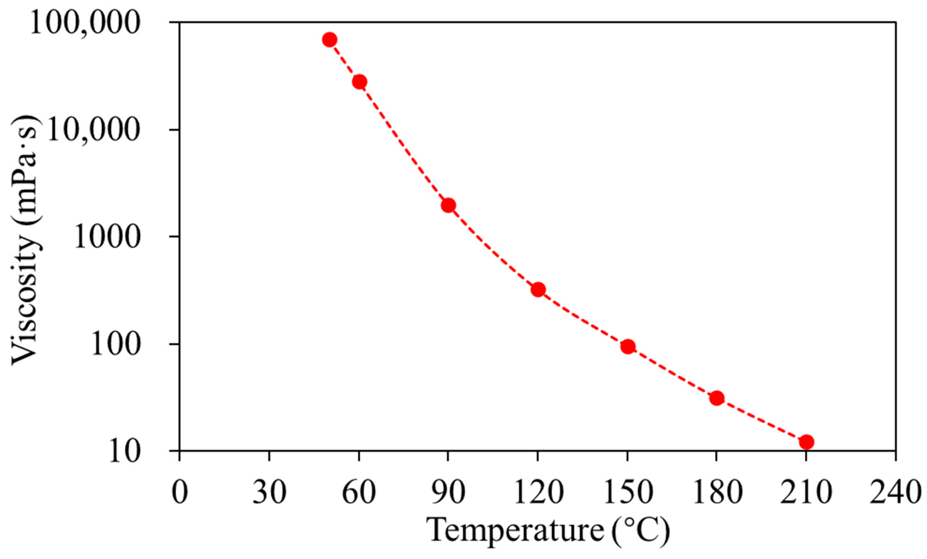 Figure 6 shows the dependence of oil viscosity on temperature. When the outlet oil cut reaches 100%, continue injecting 0.1 PV, then stop the oil injection and age for 48 h. (6) Turn on the electrical heaters in both injector and producer simultaneously to conduct SAGD electrical preheating. Meanwhile, use the automatic control box to monitor the heater surface temperature, with the maximum temperature set not to exceed 320 °C. The electrical heating power is adjusted based on temperature control. When the temperature between the injector and producer reaches 140 °C, turn off the producer heater, retain only the injector heater, and start injecting steam into the injector at 220 °C. (7) Set the model outlet back pressure at 2 MPa to ensure the steam chamber operating pressure reaches 2–2.5 MPa. Conduct continuous steam injection, continuous electrical heating, and continuous production. (8) After the steam chamber rises to the top of the oil layer, switch to injecting pure LPG solvent. Rely on the electrical heating and the pre-existing temperature field from steam injection to vaporize the injected solvent, creating a solvent chamber. (9) After injecting the predetermined amount of solvent, stop the solvent injection. (10) Continue the production with steam injection. In this stage, stop electrical heating, rely on steam heat and the preheated model to maintain production. Use the back-pressure valve to control the production fluid rate, ensuring a produced/injected ratio between 1.1 and 1.2. (11) Handle the produced fluids and gases. During the solvent injection stage, to prevent the escape of flammable and explosive solvents, use a fully enclosed process. Use a gas–liquid separator at the outlet to separate the produced solvent gas, measure it with a wet gas flow meter, and combust it remotely. For produced liquids, use a digital balance for real-time weighing, and after oil–water separation, measure and analyze the samples. For the produced crude oil, conduct a full hydrocarbon chromatography and SARA analysis to reveal the mechanism of solvent extraction on the physicochemical properties of the crude oil.