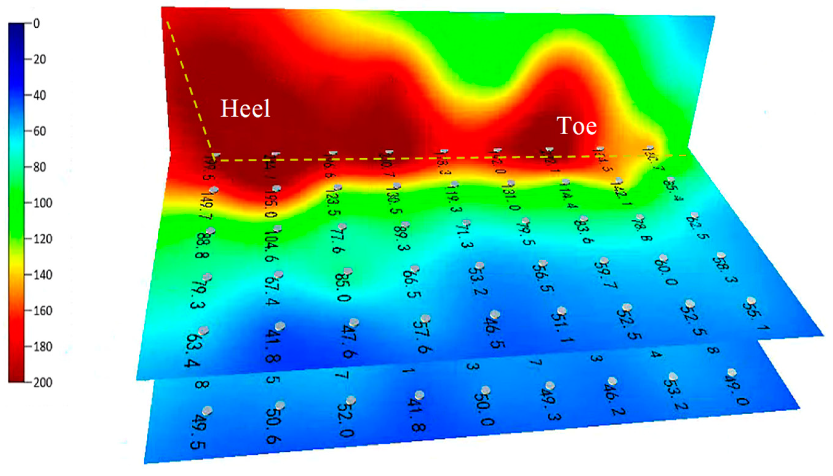 Figure 8), the temperature in the well-developed steam chamber section reaches above 200 °C, while in sections with poorer development and near the toe, the temperature is 160–180 °C.