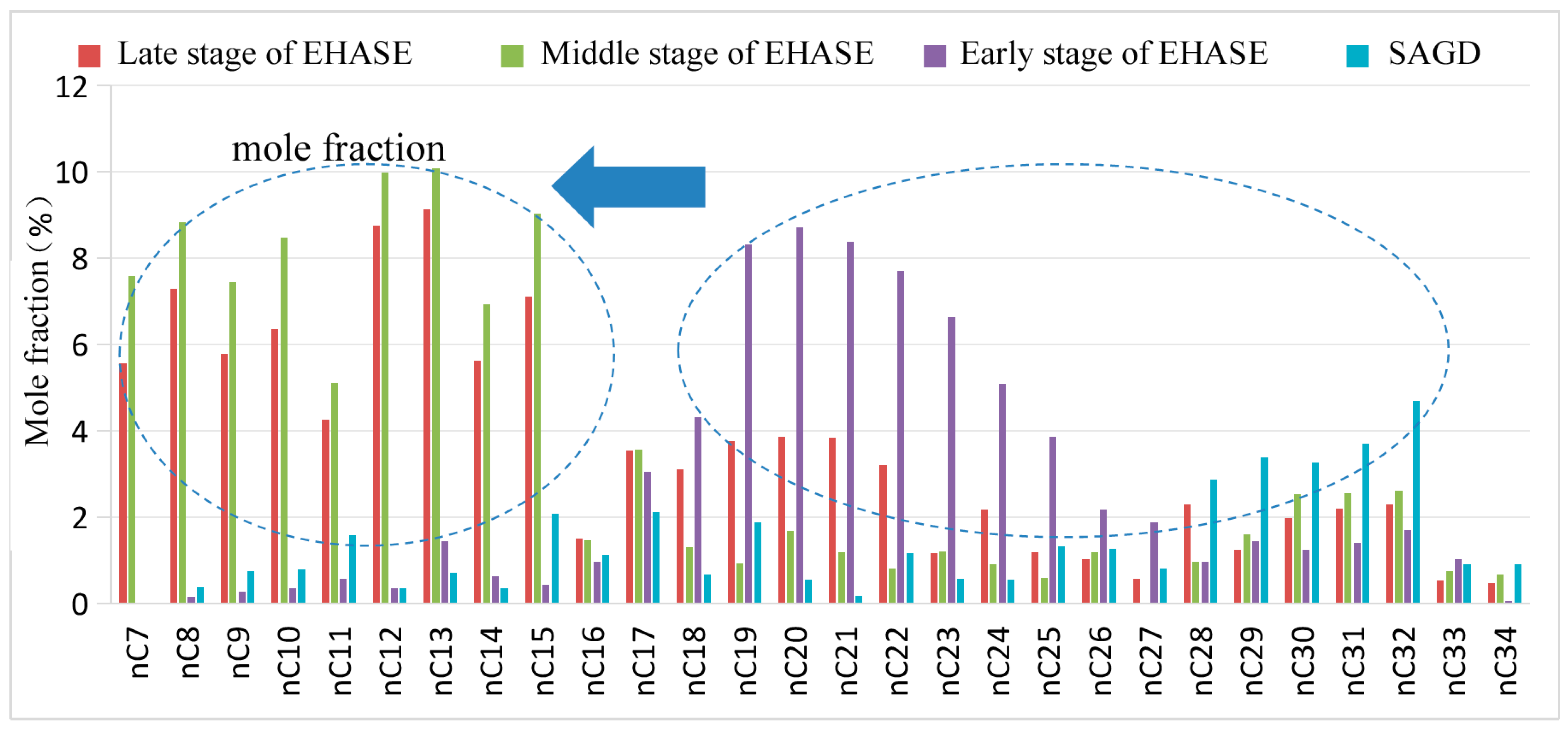 Comparison of full hydrocarbon components of produced oil during SAGD and solvent extraction stages.