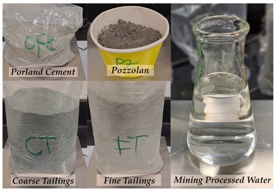 The Cemented Paste Backfill (CPB) samples were prepared from a mixture of binder (Pozzolan and/or OPC), tailings (fine and coarse), and mining-process water (Figure 1). The binders consist of Ordinary Portland Cement (OPC) and Saudi Natural Pozzolan (SNP), which was obtained from a quarry in the Madinah region, while the cement was obtained from a local supplier. The tailings and process water, representing typical mining waste materials, were supplied by Maaden Barrick Copper Company (MBCC) from their Jabal Sayid underground copper mine in the western region of Saudi Arabia.