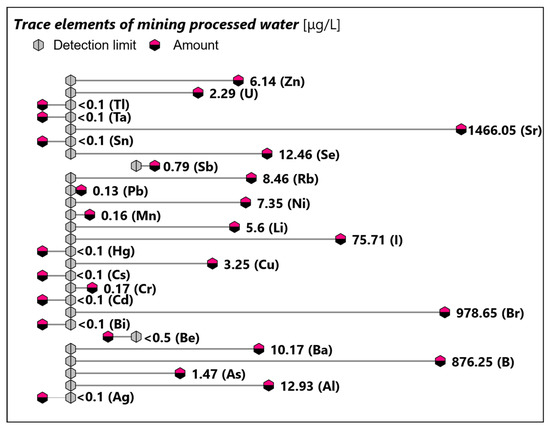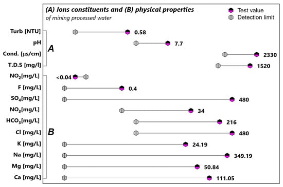 The chemical composition of all raw materials was quantified using Energy-Dispersive X-ray Spectroscopy (EDS). The analyzed materials included the binders (OPC, untreated [UT], heat-treated [HT], and mechanically treated [MT] pozzolans) and the tailings (fine and coarse). The chemical composition of solid materials is provided in Table 1. The characteristics of mining-process water are given in Figure 2 and Figure 3.