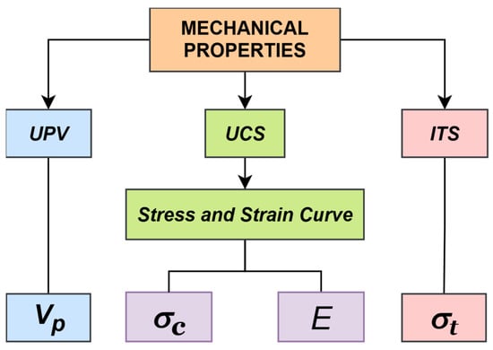 Experimental test framework: ultrasonic pulse velocity (Vp), uniaxial compressive strength (σc), elastic modulus (E), tensile strength (σt).
