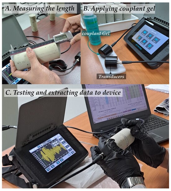 UPV is a non-destructive testing (NDT) method used to assess material homogeneity and quality. In this test, two transducers are placed on opposite sides of the specimen. One transducer emits an ultrasonic wave that travels through the specimen to the receiving transducer. The P-wave velocity (Vp) is calculated by dividing the manually measured path length (L) (Figure 7A) by the measured travel time (t) (Figure 7C).