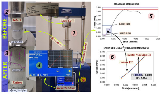 All specimens were tested for UCS using a Matest S205M-Unitronic 50 kN (manufactured by Matest, Arcore, Italy), with a 50 kN load cell (Figure 8). Specimens preparation conformed to the ASTM C39 standards for the height-to-diameter ratio [46]. The machine recorded a graph of load (in kN) versus axial deformation (in mm) for each test. The maximum compressive strength (σc) was determined from recorded data. The modulus of elasticity or Young’s modulus (E) was derived from the strain-stress curve using a linear regression applied to the linear-elastic portion of the data.