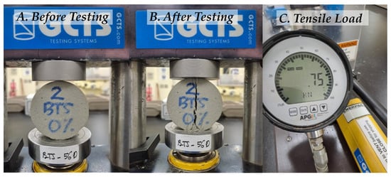 The ITS test, also known as Brazilian Tensile Strength (BTS), provides an indirect estimate of tensile strength (σt) by applying a diametrical compression load to a cylinder specimen (Figure 9). Testing was conducted in accordance with ASTM D3967 [47].