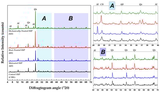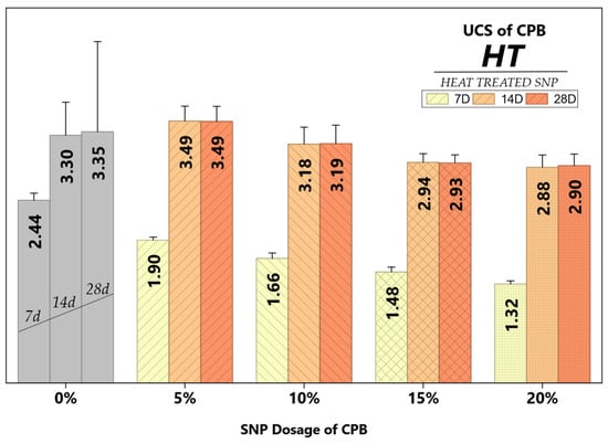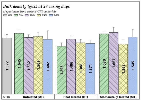 The bulk density of the CPB samples was determined at 28 days of curing, in accordance with ASTM C642 [48]. Results from three samples per mixture are presented in Figure 10. The control mixture (CTRL) contained 100% OPC and 0% SNP. Other than Control, the CPB uses SNP under three conditions: Untreated (UT), with a Blaine fineness of 0.37 m2/g; Heat-treated (HT), thermally soaked at 600 °C for 30 min; mechanically treated (MT), ground for 6 h to a Blaine fineness of 2.52 m2/g or a mean particle size (d50) of 5.8 µm. The selection of a 600 °C thermal treatment in this research was based on previous results indicating it as a practical, energy-efficient activation threshold that partially enhances the pozzolanic reactivity of natural materials, offering a balance between improved mechanical performance and reduced processing costs.