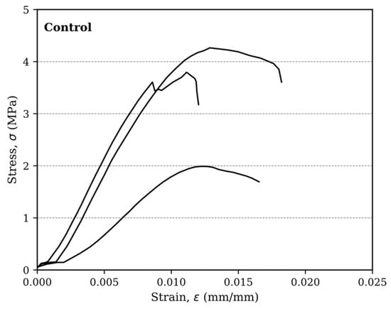 Strain-Stress Curve (SSC) of the three different CTRL specimens at 28 curing days.