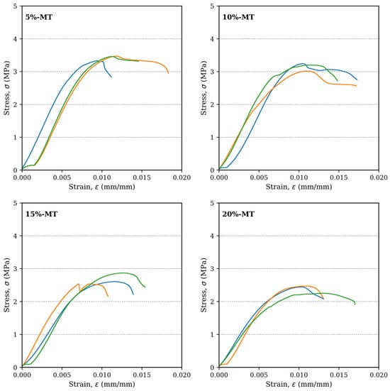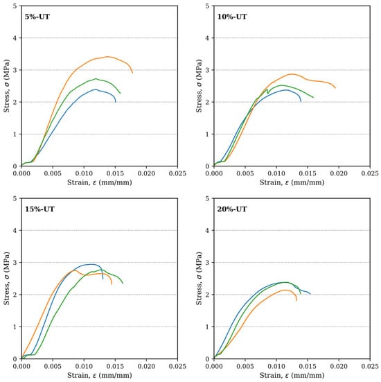 Strain-Stress Curves of the UT scenario at 28 days; Each color in each UT dosage corresponds to one of the three specimens.