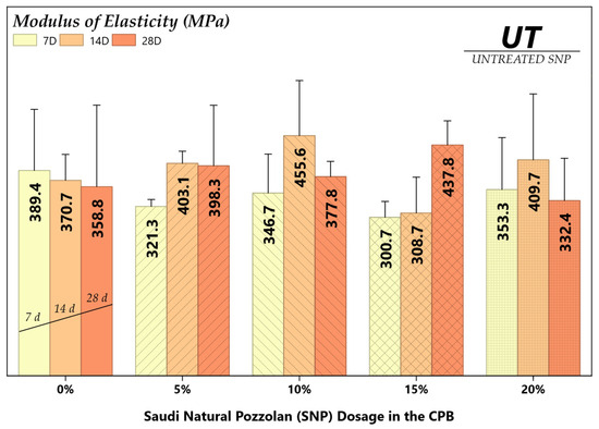 At the early curing age, the CTRL mixture was the stiffest. However, by 14 days, the UT with 10% replacement exhibited a 23% higher elastic modulus (E) than CTRL. At 28 days, the UT (15%) mixture showed a higher E than CTRL, which was consistent with the 14-day observation.