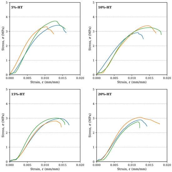 Strain-Stress Curves (SSC) of the HT scenario at 28 days; Each color in each UT dosage corresponds to one of the three specimens.