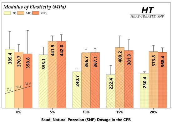 The elastic moduli for HT samples were derived from SSCs, as shown in Figure 14 and Table 5. Meanwhile, the average E was illustrated in Figure 15. They show that CTRL was the stiffest at early ages. However, by 14 and 28 days, the HT (5%) mixture demonstrated a 19% and 23% higher stiffness than CTRL materials at 7 days of curing, respectively. The other HT dosages (10–20%) showed E values approximately 40% lower than CTRL at early curing periods.