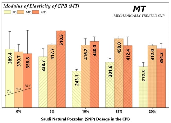 The average elastic modulus of MT specimens at different curing days for various replacement conditions.
