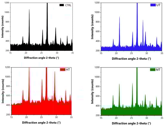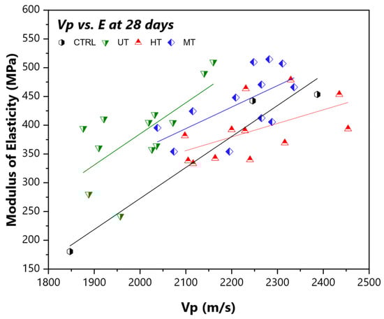 Even though the Control mix exhibited high stiffness at an early age, UT, HT, and MT exceeded the CTRL’s stiffness at 14 and 28 days of curing. Specifically, UT (10%), HT (5%), and MT (5%) exhibited the highest elastic modulus values at 14 days, approximately 19% higher than those of the control mixture. At 28 days of curing, UT (15%), HT (5%), and MT (5%) had the highest elastic modulus, where UT (15%) and HT (5%) showed the highest stiffness, with MT (5%) exhibiting a 42% higher elastic modulus than the control mix.
