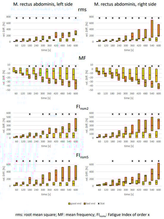 M. rectus abdominis: Comparison of electrophysiological relative changes between “good end” and “bad end” based on the Borg scale during a 10 min static endurance test of the abdominal muscles at 50% of the upper body weight (UBW). The values are presented as median ± upper and lower quartile range. Asterisks denote significant differences between the groups with p < 0.05 (U-test, Bonferroni–Holm corrected [46]).