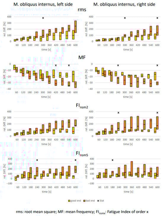 M. obliquus internus: Comparison of electrophysiological relative changes between “good end” and “bad end” based on the Borg scale during a 10 min static endurance test of the abdominal muscles at 50% of the upper body weight (UBW). The values are presented as median ± upper and lower quartile range. Asterisks denote significant differences between the groups with p < 0.05 (U-test, Bonferroni–Holm corrected [46]).