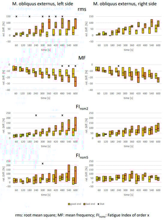 M. obliquus externus: Comparison of electrophysiological relative changes between “good end” and “bad end” based on the Borg scale during a 10 min static endurance test of the abdominal muscles at 50% of the upper body weight (UBW). The values are presented as median ± upper and lower quartile range. Asterisks denote significant differences between the groups with p < 0.05 (U-test, Bonferroni–Holm corrected [46]).