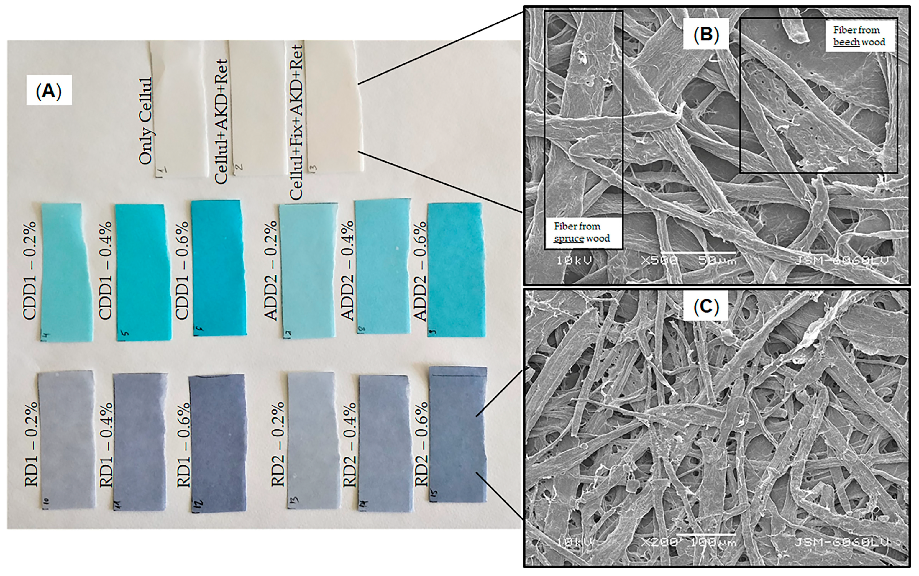 3.1. Dyes’ Influence on Paper Slurries’ Characteristics
