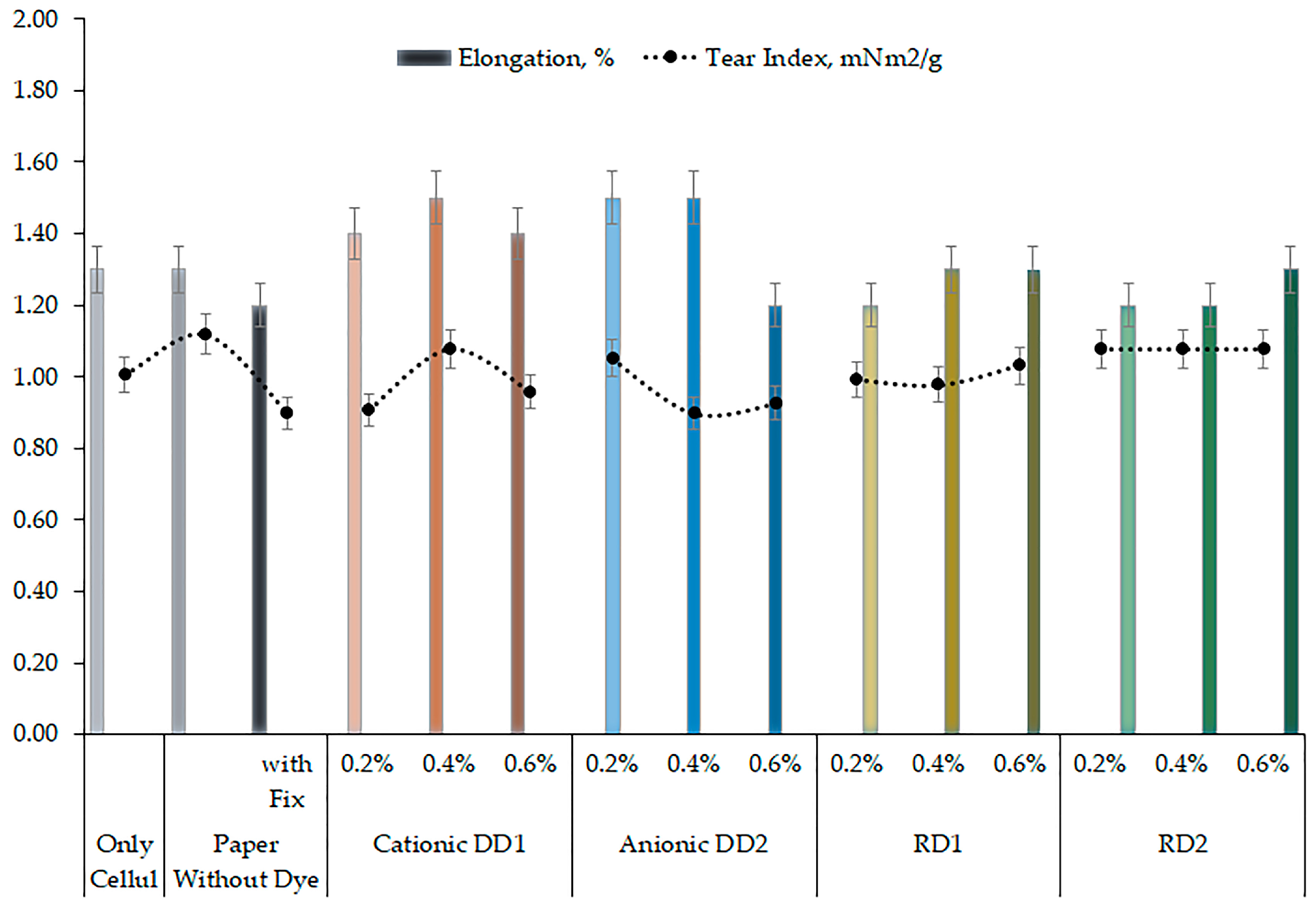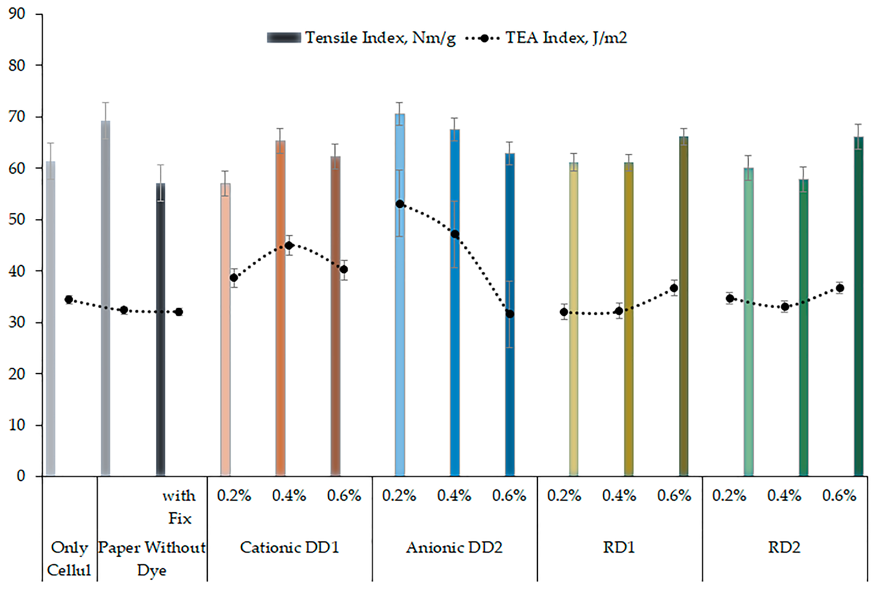 3.2. Dyes’ Influence on Paper Samples’ Characteristics
