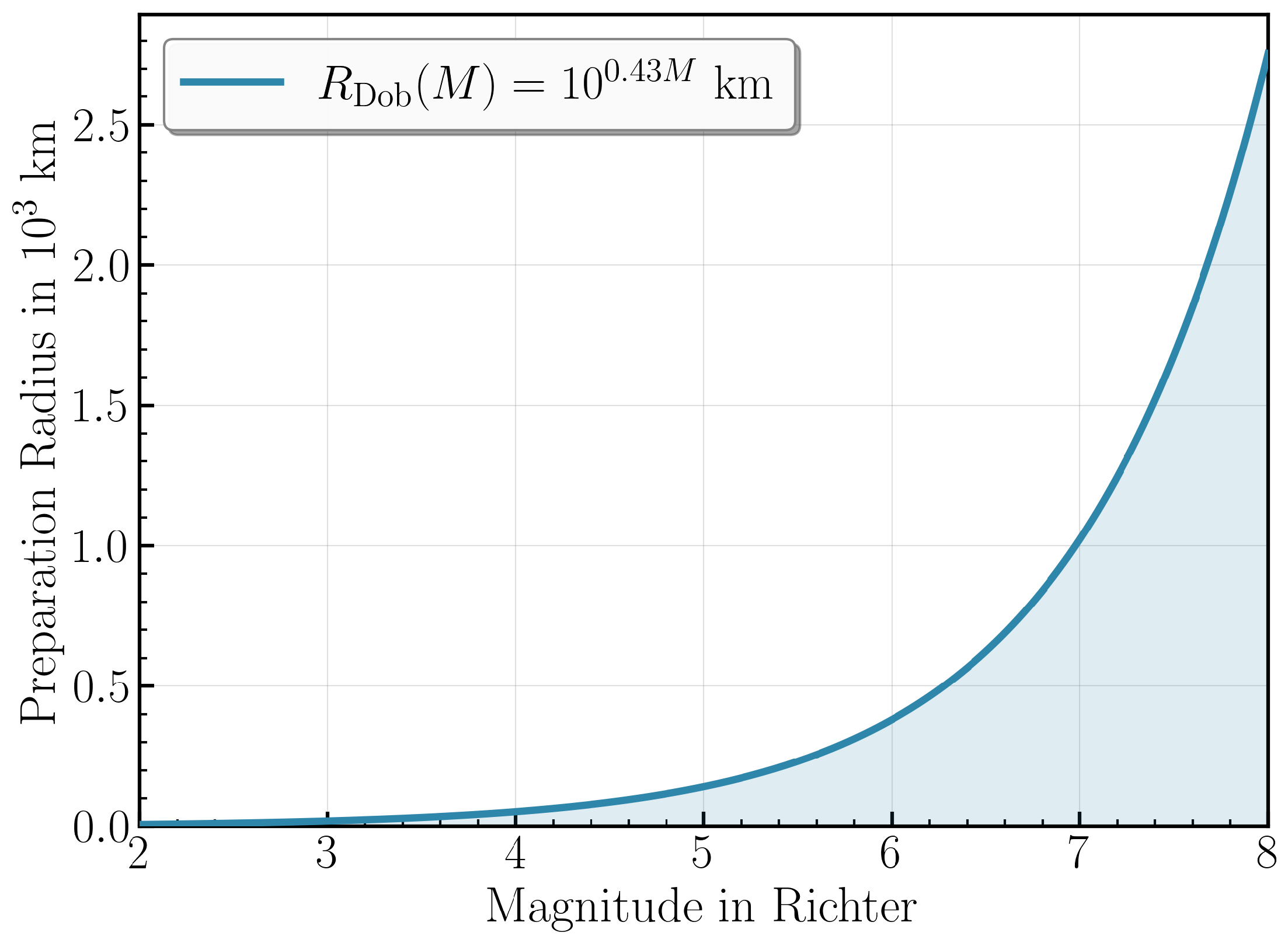 - Dobrovolsky, I.P.; Zubkov, S.I.; Miachkin, V.I. Estimation of the size of earthquake preparation zones. Pure Appl. Geophys. 1979, 117, 1025–1044. [Google Scholar] [CrossRef]