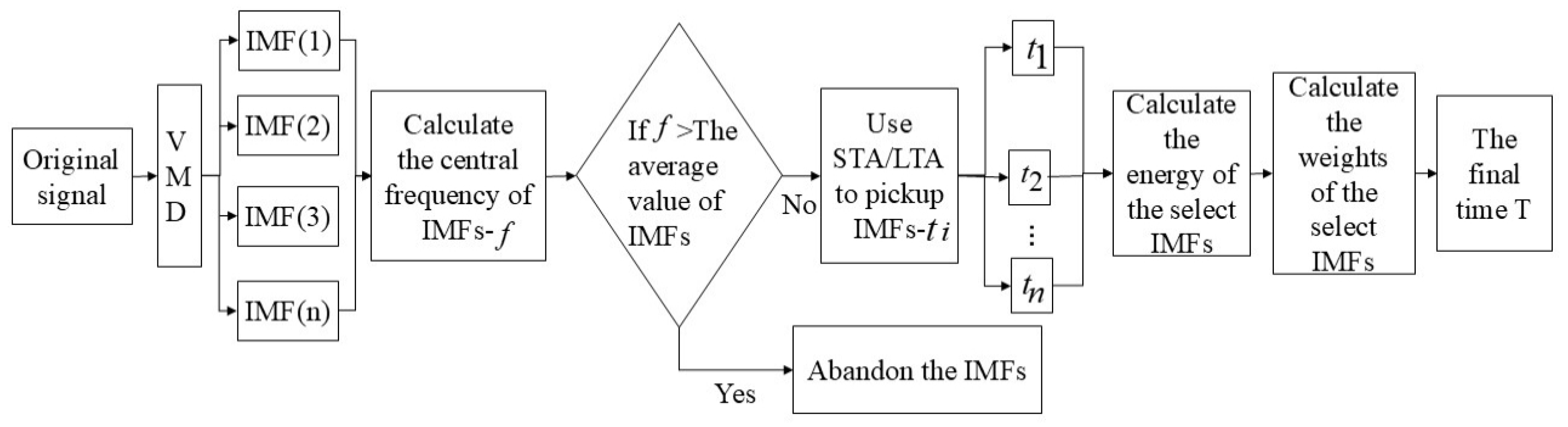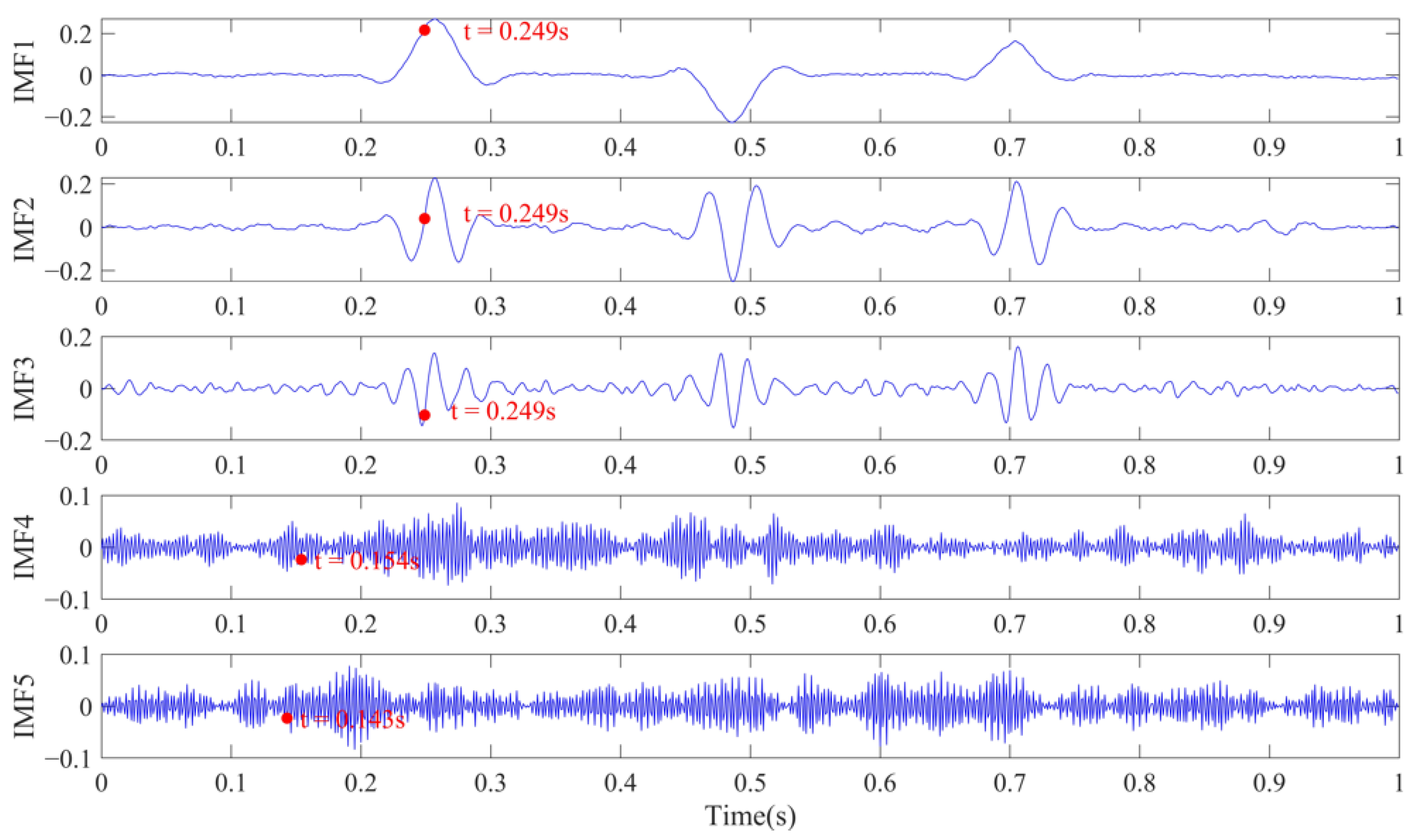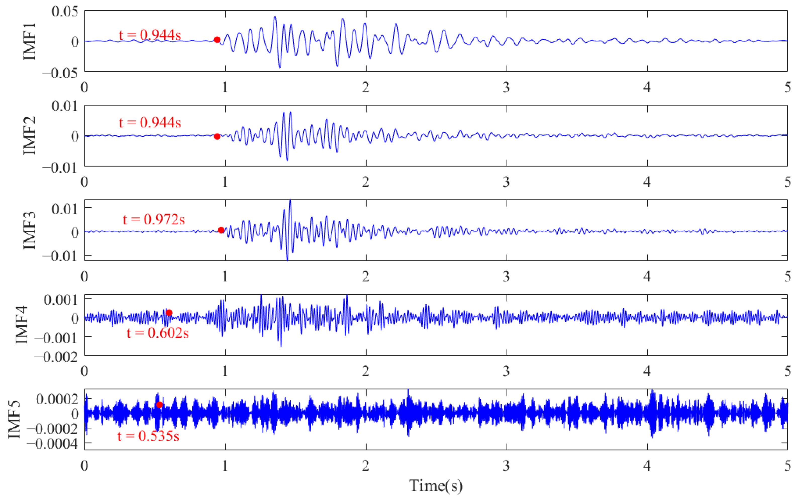 - To fuse the arrival time-picking results from the selected IMFs, an adaptive energy-weighted approach is employed that requires computing the energy value of each selected IMF component as follows:
