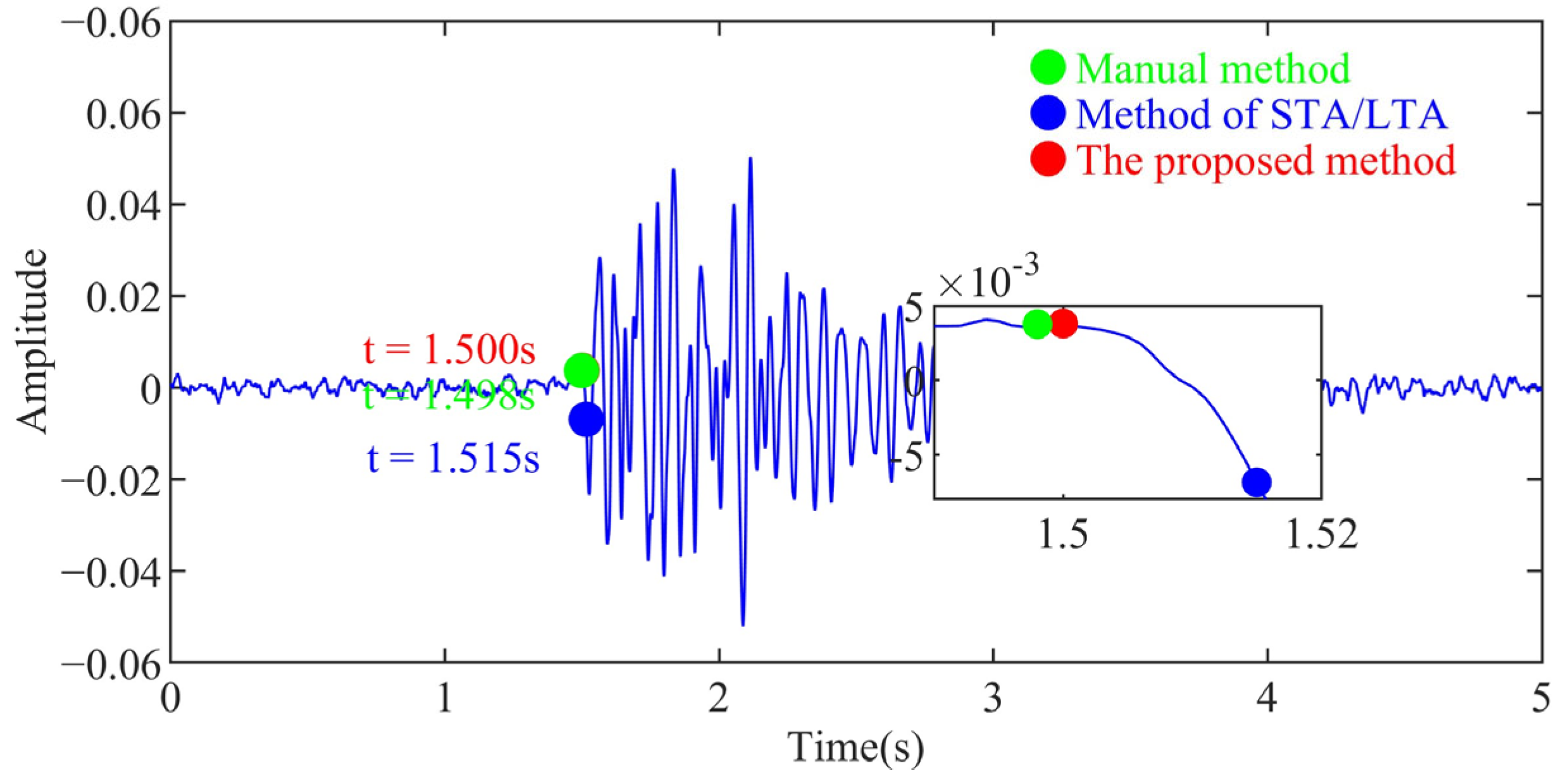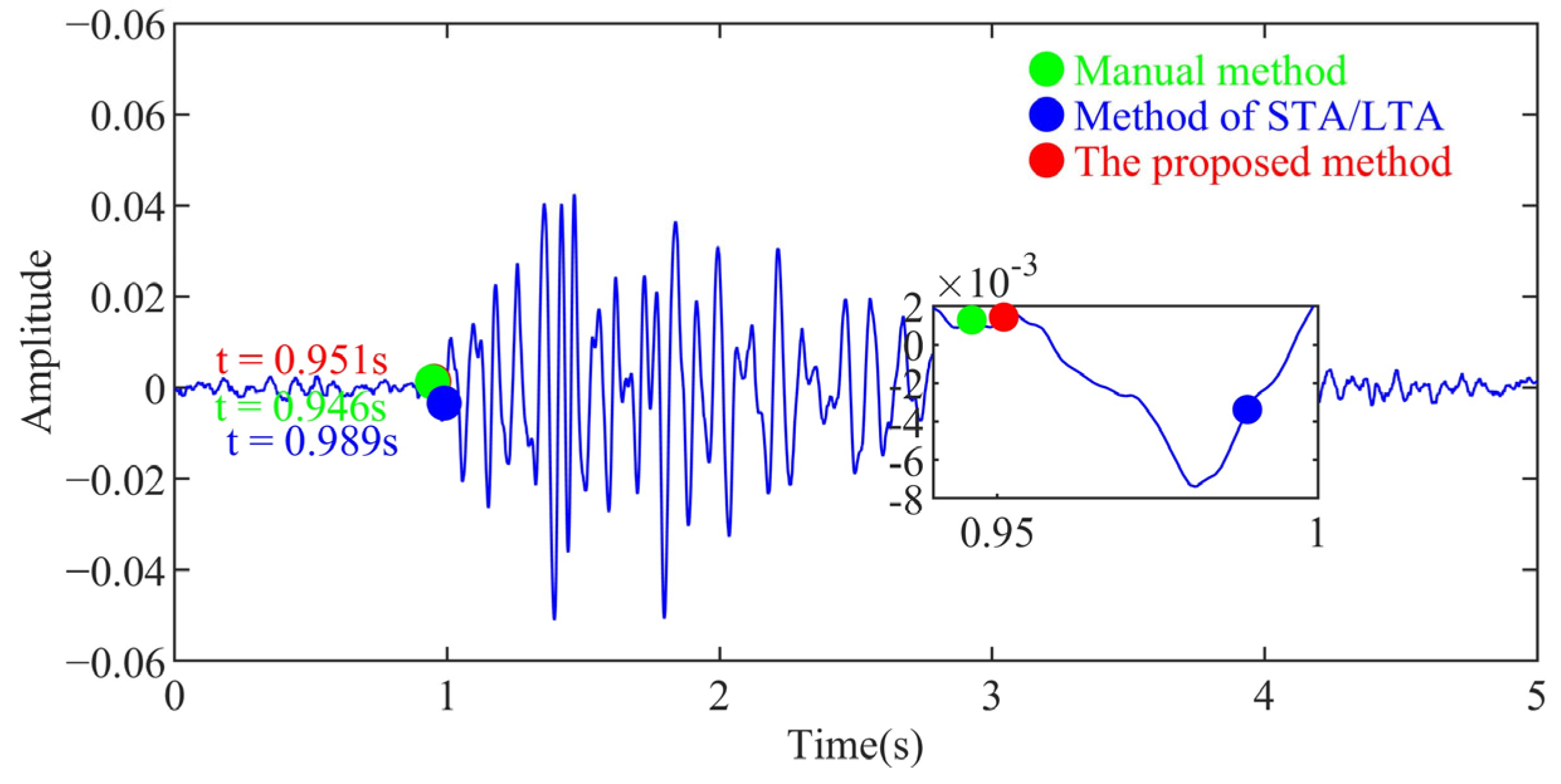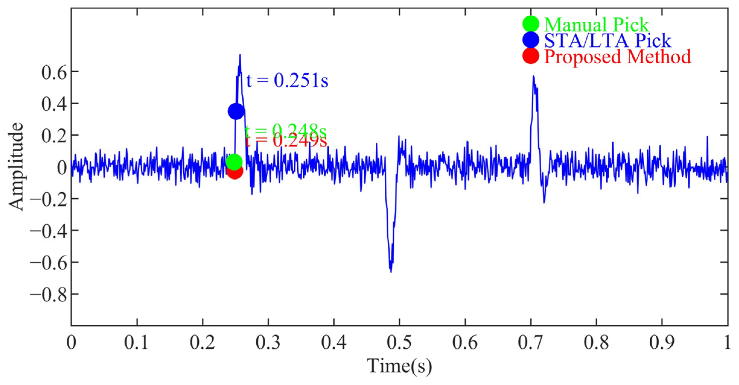 - Lei, Q.; Cai, H. STA/LTA method for picking up the first arrival of natural seismic waves and its improvement analysis. Prog. Geophys. 2023, 38, 1497–1506. (In Chinese) [Google Scholar]