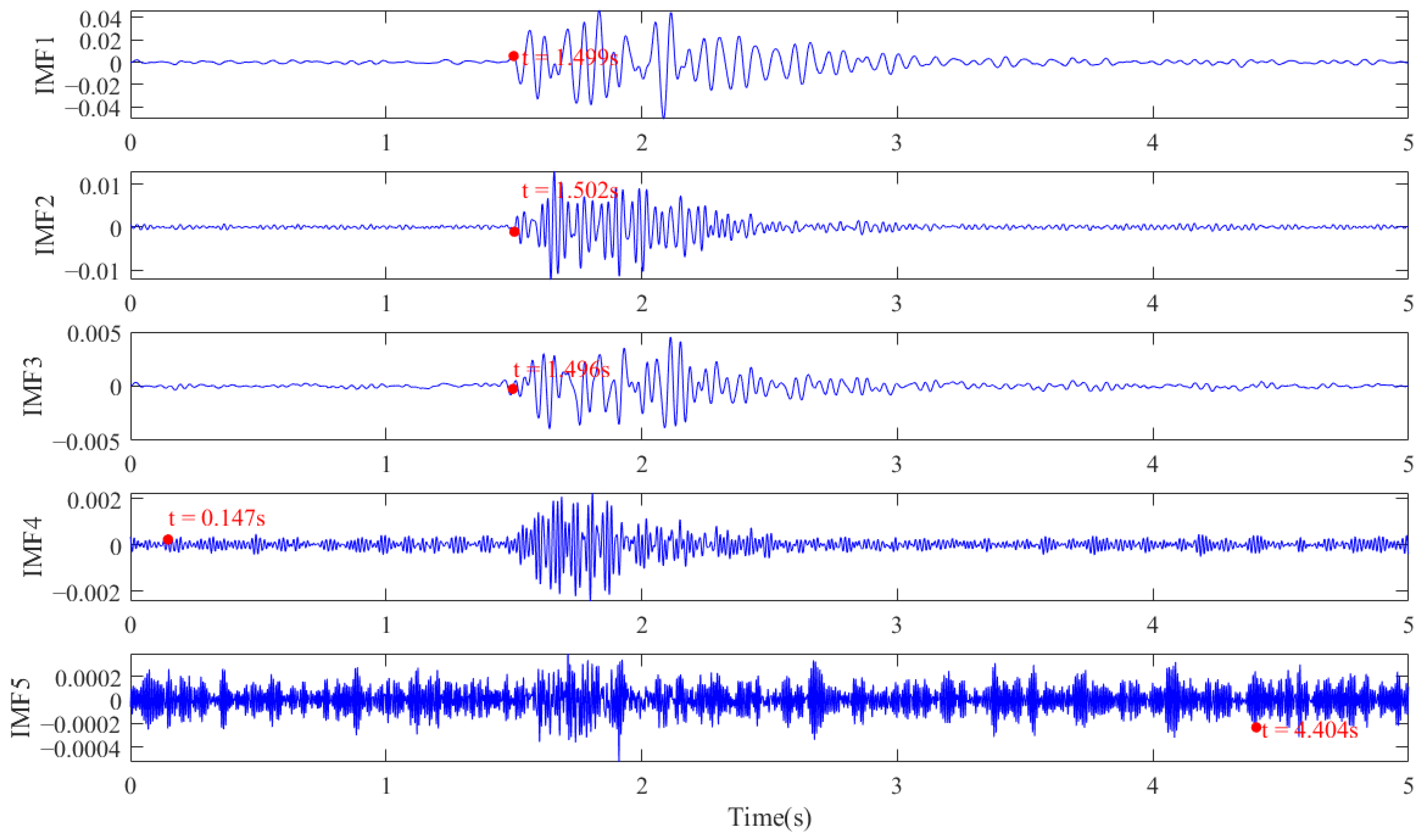 - The proposed method establishes the mean value of IMFs’ center frequencies as the selection criterion, classifying modal components with sub-average center frequencies as the effective signal-bearing elements. STA/LTA is implemented on the selected IMFs to pick arrival time. The STA and LTA are then computed as follows:
