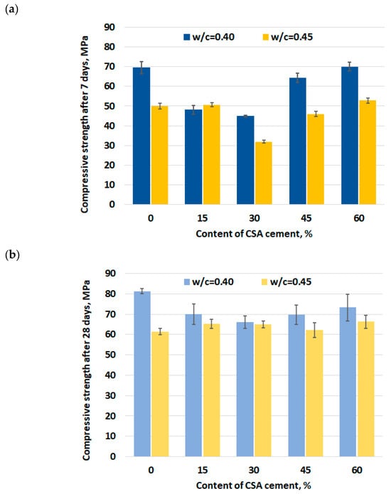 Compressive strength results after (a) 7 days and (b) 28 days of curing for mixtures with varying CSA cement contents and water-to-cement ratios.