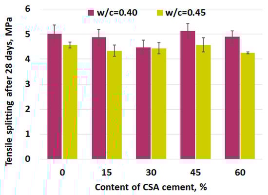 Tensile splitting strength results after 28 days of curing for mixtures with varying CSA cement contents and water-to-cement ratios.