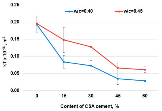 Gas permeability coefficient kT as a function of CSA cement content and water-to-cement ratio, measured using the Torrent method.
