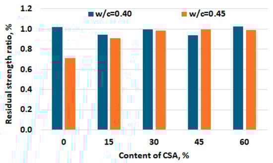 Residual compressive strength ratio after freeze–thaw cycling as a function of CSA cement content and water-to-cement ratio.