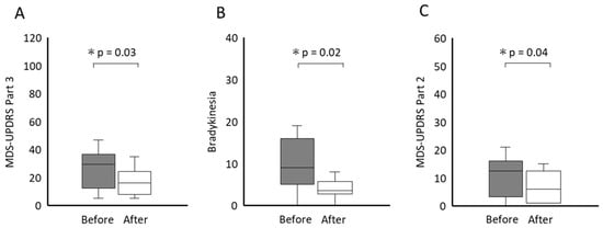 Scores of the MDS-UPDRS Part 3 (A), Bradykinesia (B), MDS-UPDRS Part 2 (C) before and after the intervention. The central thick lines of the boxplot represent medians; box limits comprise the interquartile range from 25 and 75%. * p < 0.05. MDS-UPDRS, Movement Disorder Society-sponsored revision of the Unified Parkinson’s Disease Rating Scale.