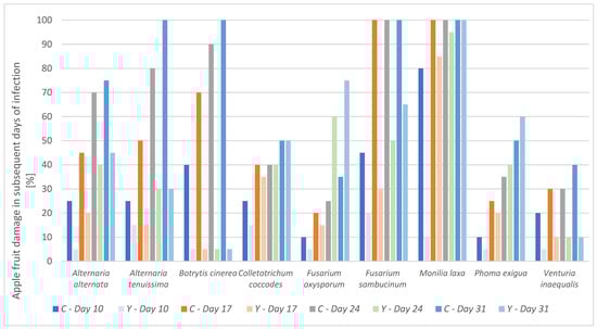Percentage of apple infection by the phytopathogen on given days. C—control sample infected with phytopathogens, Y—sample infected with phytopathogen and treated with yeast M. pulcherrima D2 culture.