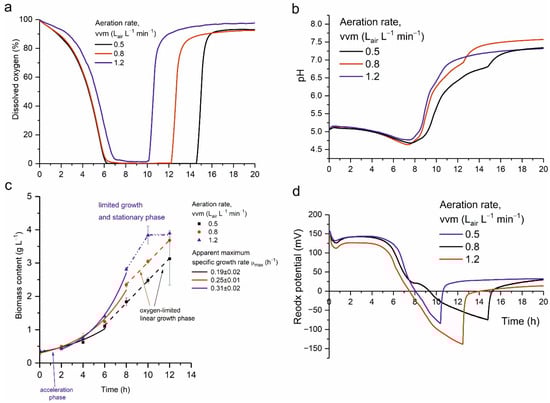 Kinetics of M. pulcherrima D2 cultivation in a bioreactor, showing changes in (a) dissolved oxygen, (b) pH values, (c) biomass content, and (d) redox potential at aeration rates (vvm) of 0.5, 0.8, and 1.2 Lair L−1 min−1.